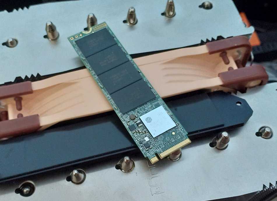 Некоторые M.2 накопители имеют расположение чипов с одной стороны, но наша 512-гигабайтная карточка Transcend MTE110S имеет 2-сторонний дизайн, а вы наверняка уже наслышаны о том, что накопители подобного типа очень сильно греются при работе. Источник тепла — контроллер, маленький чип, который легко может нагреваться до 90 градусов Цельсия. В нашем тестовом Transcend MTE110S используется контроллер Silicon Motion SM2263XT. Он интересен тем, что использует для кэширования ОЗУ компьютера (технология HMB), что позволяет удешевлять SSD накопитель, не устанавливая на него DRAM-чипы. Данная технология автоматически включается в операционных системах Windows 10 Fall Creator’s Update (версия 1709 и более поздняя).
