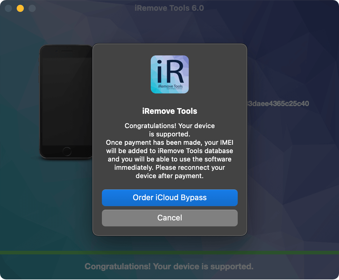 Шаг 6. Если Вы видите сообщение «Congratulation! Your device is supported»это означает что Ваш айфон или айпед поддерживается программой iRemove Tools и Вы можете удалить учетную запись Apple id предыдущего владельца! Нажмите на кнопку «Make Paymant» и акажите услугу удаления iCloud, заполните форму и оплатите. После оплаты IMEI и серийный номер устройства будет автоматически добавлен в базу iRemove Tools и Вы сможете воспользоваться программой!
