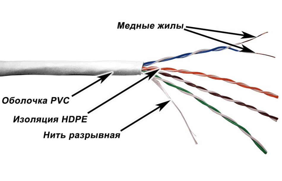 Название свое он получил из строения. Внутри идут медные провода в оболочке, скрученные попарно. Скручивание делают с определенным шагом в зависимости от количества таких пар. Вся фишка такого скручивания – взаимное гашение помех для улучшения качества сигнала в рабочей сети (ведь по этому проводу тоже идет электричество, хоть и не 220V, а надежность здесь нужна на высоком уровне, но это тема уже стандартов).