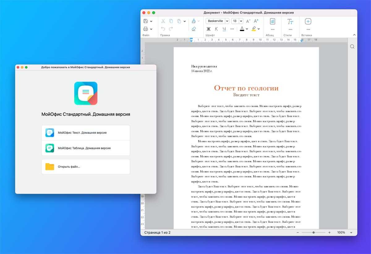 После установки вы получаете пакет МойОфис Стандартный. Домашняя версия, в котором есть текстовый редактор и приложение для работы с таблицами. Обе утилиты полностью совместимы с форматами документов Microsoft Office и имеют схожий с популярным приложением интерфейс. Поддерживаются файлы DOCX, XLSX, ODT, ODS. Есть экспорт в PDF.