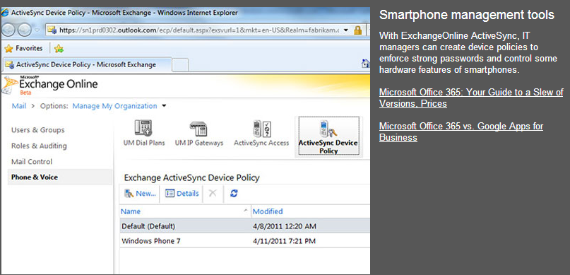 По большей части, администраторы Office 365 будут работать в едином портале администрации, которая сочетает в себе все инструменты управления, необходимые для Exchange, SharePoint, Lync и серверов, а также все основные ориентированные на пользователя инструменты. Можно настроить пользователей, почтовые ящики, настройки сайта, параметры скачивания и многое другое из единого веб-интерфейса. Кроме того, вы можете контролировать медицинское обслуживание и ремонтные работы с легко читаемой панели.