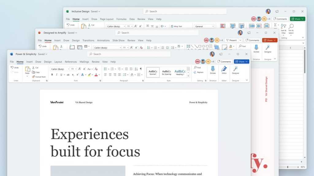 Microsoft Office 2021 имеет новый дизайн с обновленным ленточным интерфейсом, закругленными углами окон и нейтральной цветовой палитрой, которая соответствует изменениям пользовательского интерфейса в Windows 11.