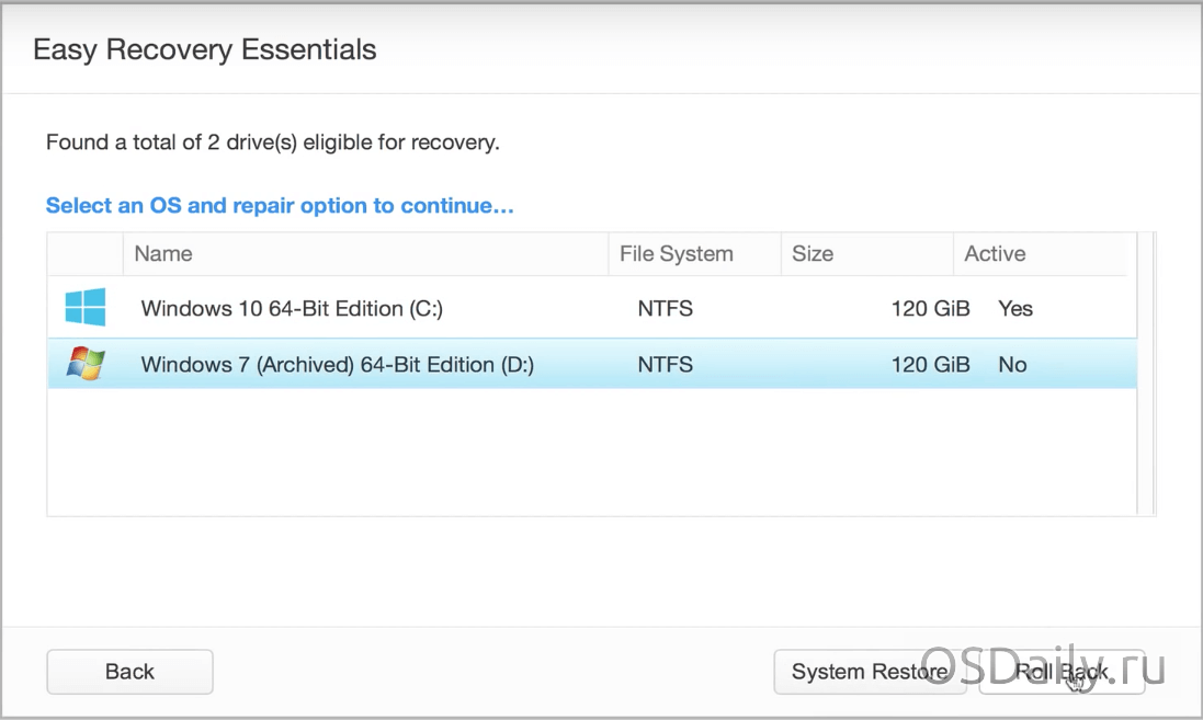 - В следующем окне откроется выбор операционных систем – найдите там пункт «Windows 7 (Archived)», выделите его и нажмите на кнопку «Roll Back». Если же средство сообщает, что установленная версия ОС слишком свежая, выберите вариант «System Restore».