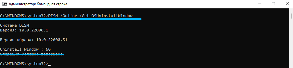 - в окне консоли вводим команду DISM /Online /Get-OSUninstallWindow, завершая нажатием Enter – это способ узнать, каков текущий период возврата. Если в строке Uninstall Windows стоит цифра 10, значит, тестовый период ещё не завершился и его можно продлить. Если имеется запись об ошибке, вернуться описанным выше способом уже не получится, как и продлить период возврата;