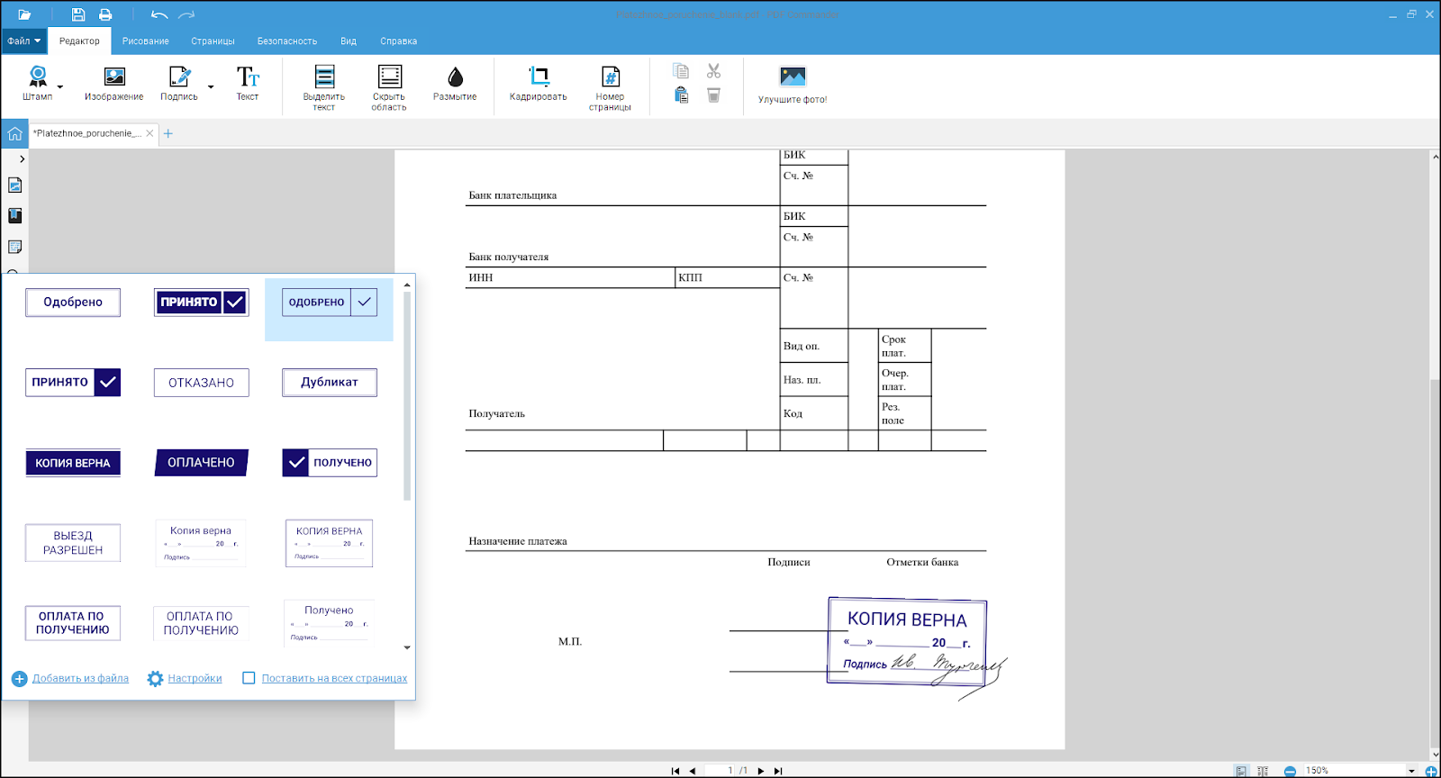 Кроме подписи, можно вставить штамп, и поместить его прямо в текст. После этого, развернуть под нужным углом (в программе заготовлен набор наиболее популярных штампов).