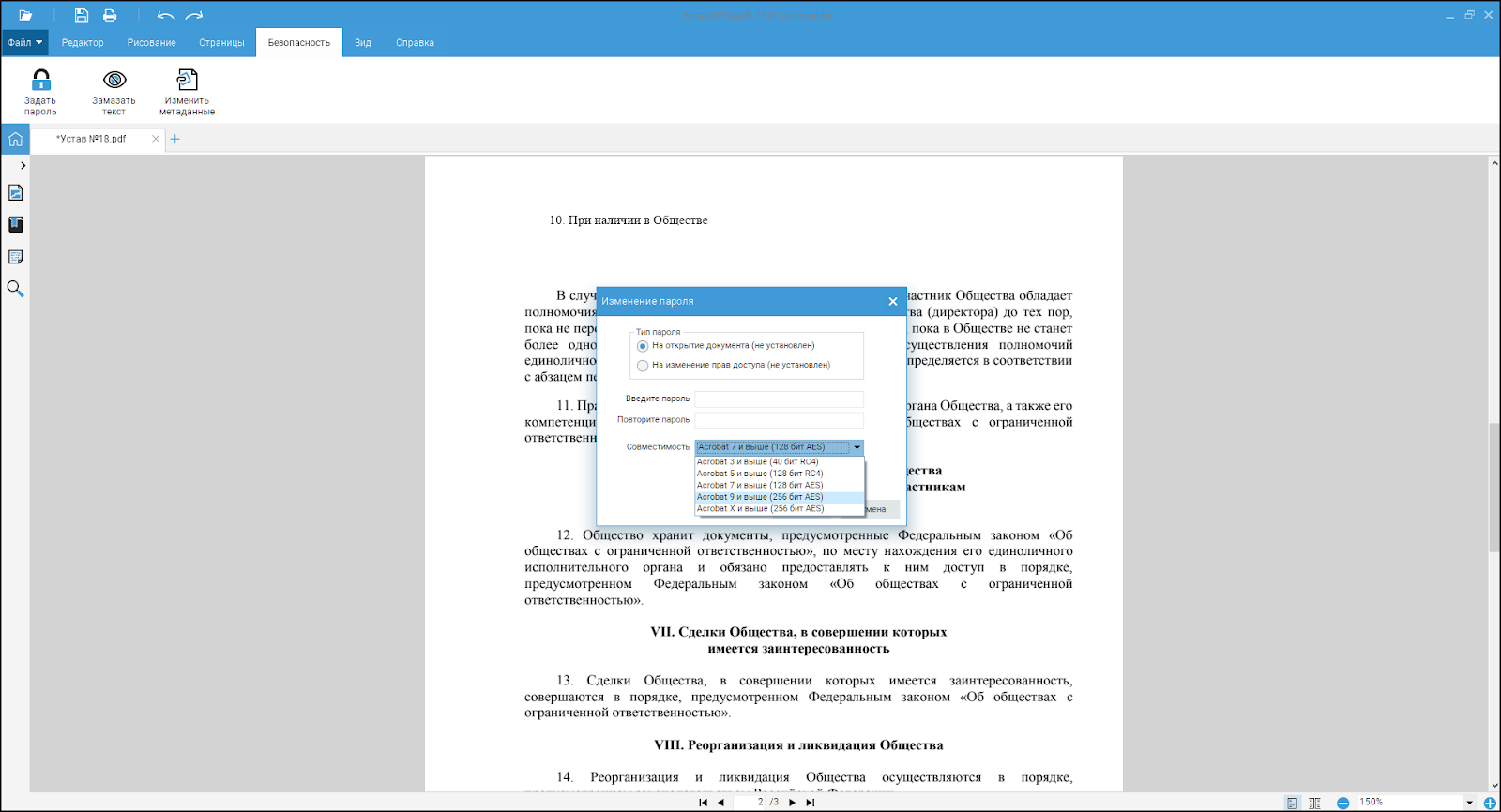 На вкладке «Безопасность» есть функция сохранения конфиденциальности документов. Вы можете установить пароль, размыть определенный текст, изменить метаданные.