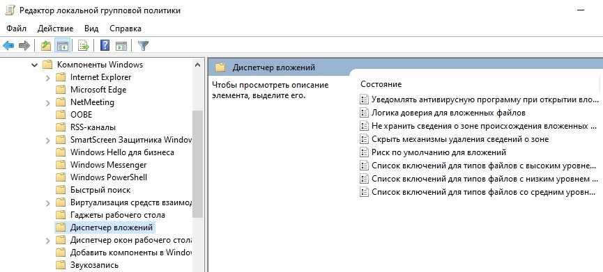 В левом навигационном меню откройте разделы в следующем порядке: «Конфигурация пользователя – Административный шаблоны – компоненты Windows – Диспетчер вложений».