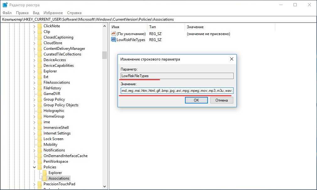- В разделе «Associations» создайте строковый параметр с названием «LowRiskFileTypes».