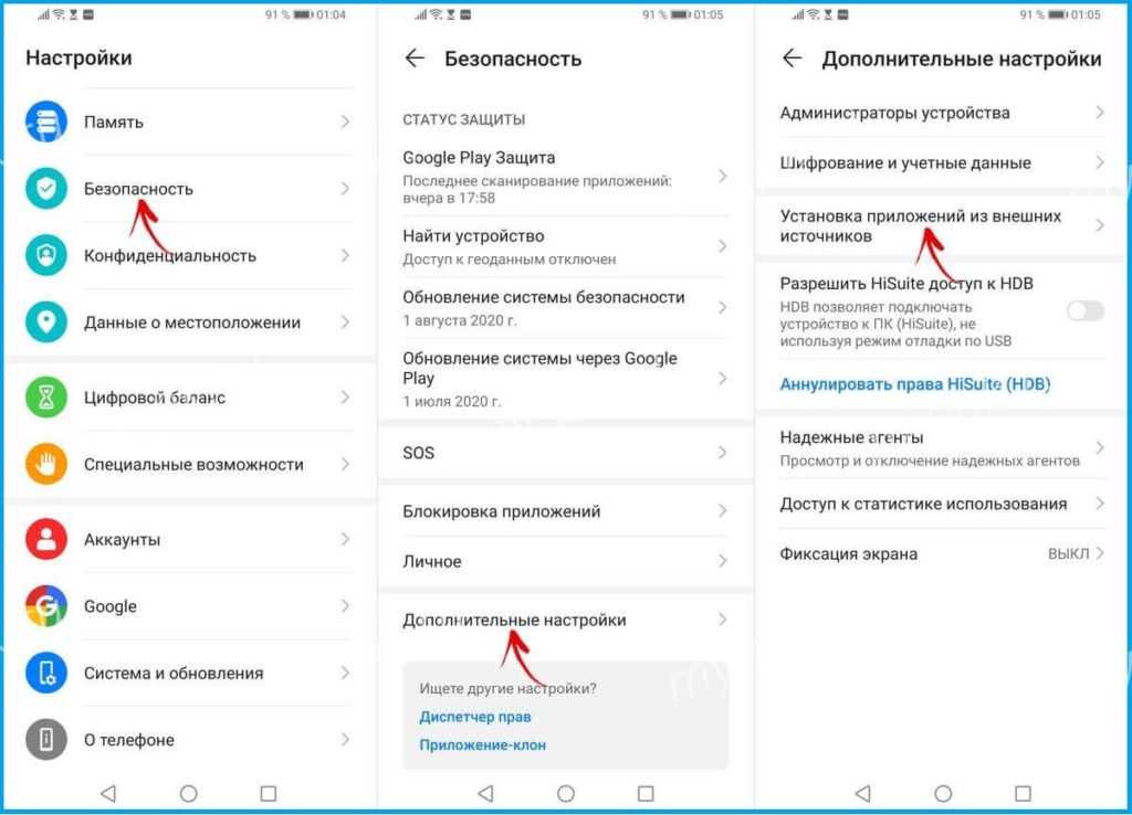 - Honor/Huawei (EMUI) — Открываем системные параметры и выбираем «Безопасность». Далее, выбираем подпункт «Дополнительные настройки». Завершающим этапом будет нажатие на кнопку «Установка приложений из внешних источников». Выбираем программу и активируем параметр «Разрешить установку приложений».