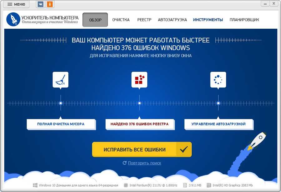 Ускоритель Компьютера произведет комплексную очистку и оптимизацию вашего ПК