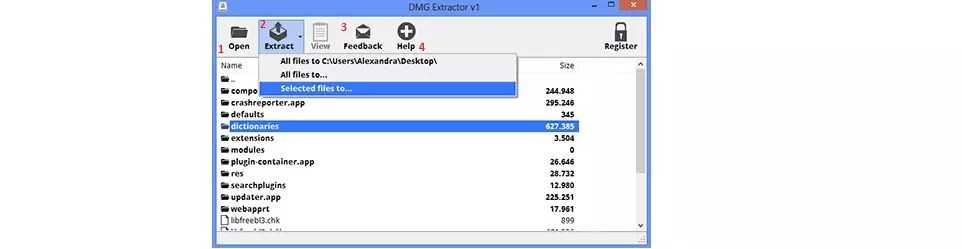 Важно! Отличительной особенностью DMG Extractor является невозможность открывать элементы размером более 4 ГБ