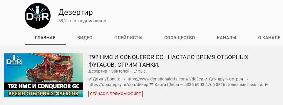 Канал Дизертир — полностью посвящен стримам игры в World of Tanks