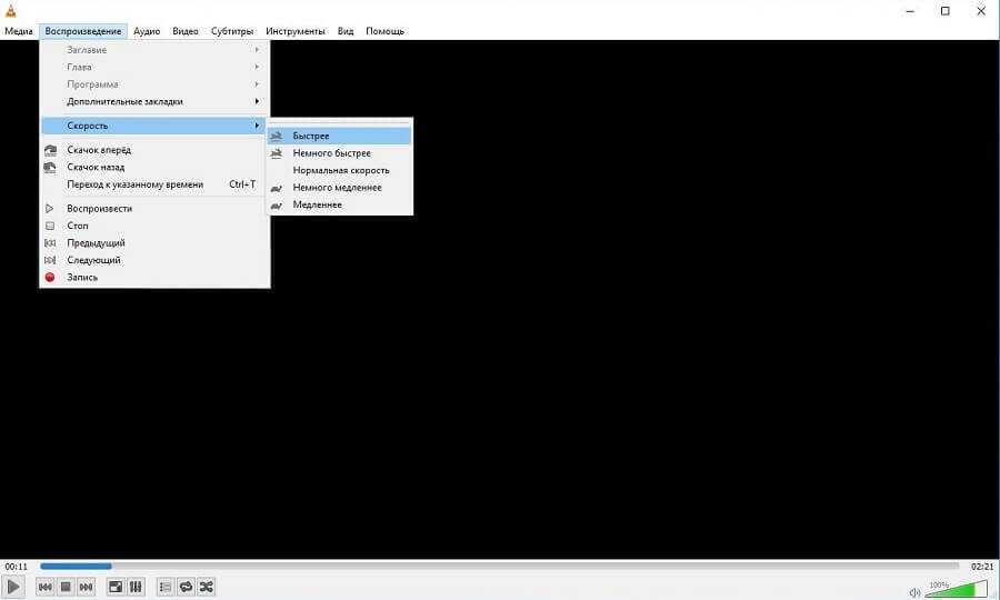 - На верхней панели нажмите «Воспроизведение» — «Скорость». Выберите подходящее действие.