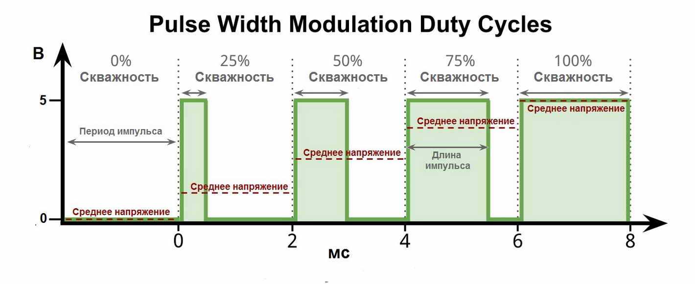 Скважность импульса определяет уровень выходного напряжения, которая вычисляется как отношение периода к длительности импульса. Таким образом, этот электронный ключ постоянно подключает/отключает входное напряжение, равное +12 В, к этому напряжению подключена нагрузка