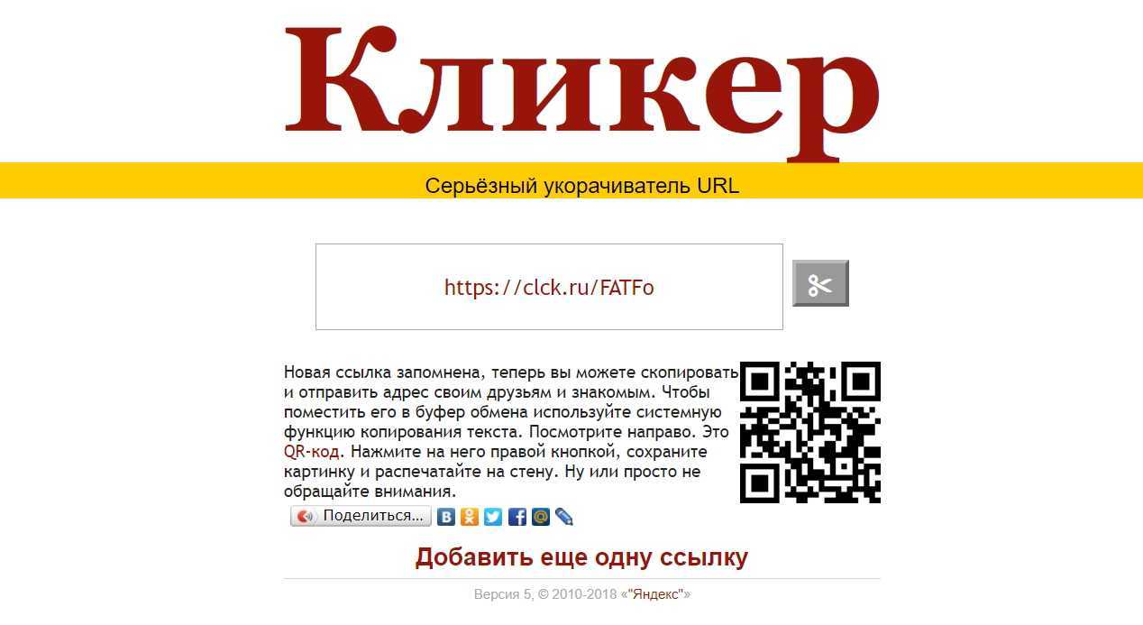 Укорачиватель “кликер” — продукт Яндекса, который переводит предоставляемые ссылки в формат clck.ru. Также кликер создает QR-код, который можно сохранять в формате изображения. Дополнительно сервис дублирует укороченную ссылку, повторяя каждую ее букву.