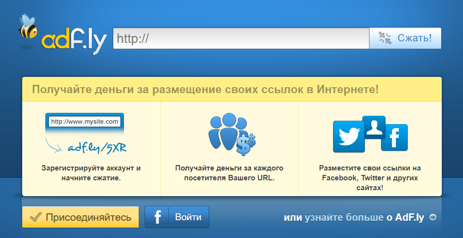 Adf.ly можно назвать «историческим» сервисом, так как он работает очень давно, и считается самым старым в сфере сокращения ссылок. Но благодаря своему возрасту, сервис имеет на порядок больше функций чем другие подобные сервисы. Минимальная сумма выплаты всего 5$.