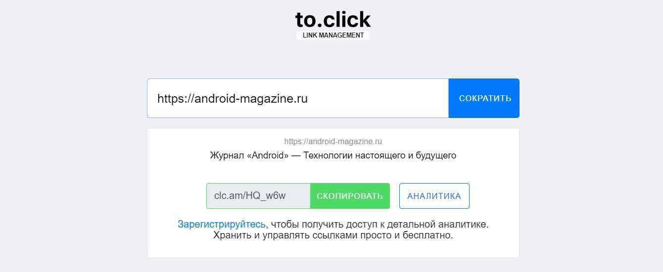 Данный сервис сокращает и редактирует предоставленные ссылки, а также анализирует весь трафик, который с ними связан. Ссылками можно руководить с помощью API. Еще одна интересная опция от to.click — сокращение адреса с помощью телеграмного бота.