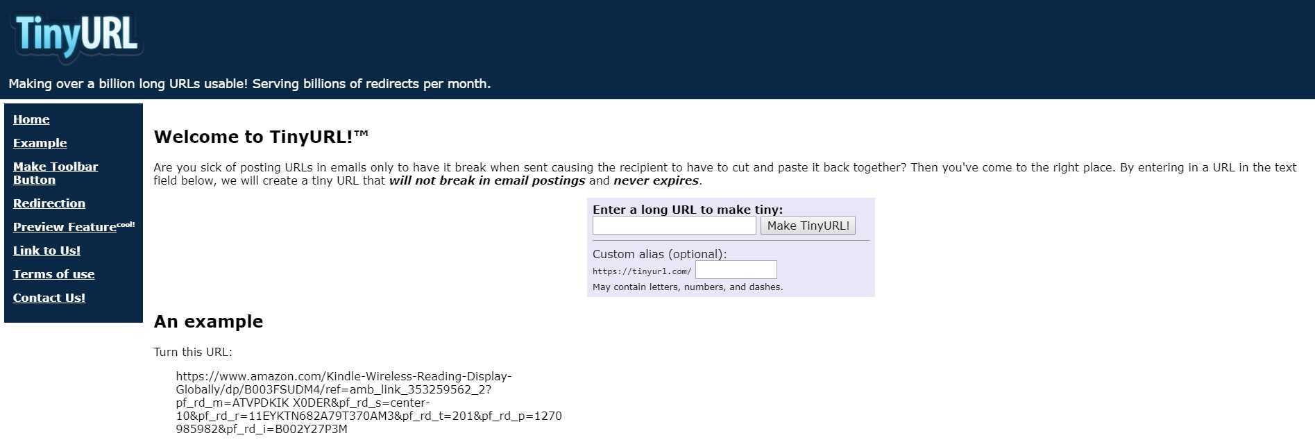 TinyUrl.com — один из первых сервисов-сокращетелей, который за это время набрал довольно-таки солидную армию приверженцев. Правда его текущий внешний вид несколько не соответствует взыскательным требования пользователей, но работает он вполне исправно.