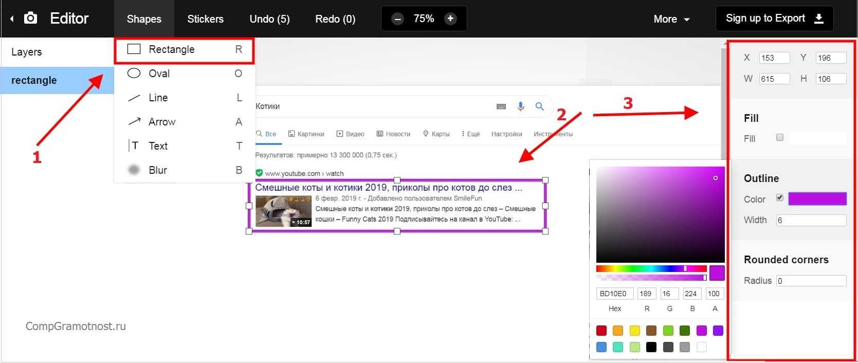 Цифра 3 на рис. 6 – Сбоку справа появится панель инструментов, где можно поменять цвет прямоугольника, толщину линий или скруглить углы. Также можно заполнить нужным цветом (если нужно что-нибудь закрасить, например).