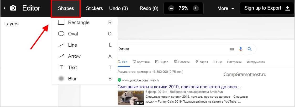 Рис. 5 (Кликните для увеличения). Возможности функции «Shapes» (то есть, «Формы») для редактирования скриншота.