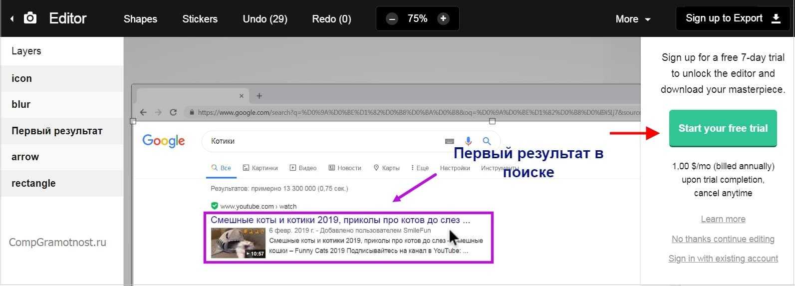Если нет желания использовать сторонние редакторы для редактирования скриншота, то можно воспользоваться тем редактором, который есть в Full Page Screen Capture. Использование такого редактора первые 7 дней бесплатно, а затем 1$ в месяц.