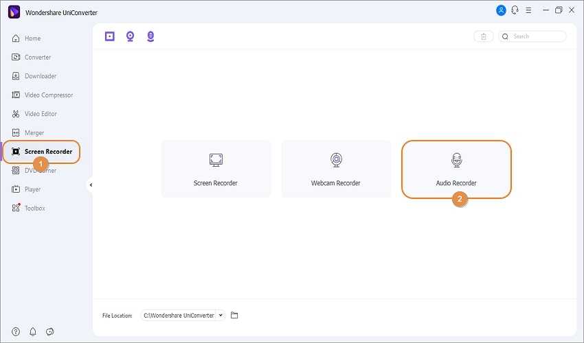 Установите и запустите UniConverter 13 на своем компьютере, а затем перейдите на вкладку «Запись экрана» . Затем вы увидите функции для «Записи экрана» , «Записи веб-камеры» и «Записи звука». Для задачи, которая рассматривается в этой статье, щелкните на первый вариант, чтобы запустить инструмент.