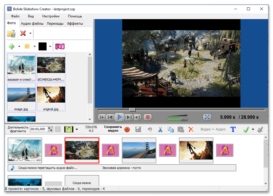 Еще одно программное обеспечение с готовыми шаблонами, Мастером быстрого создания слайд-шоу и широкими возможностями для реализации практически любых идей. В наличии музыкальная коллекция из сотен композиций, более 200 эффектов, множество титров и переходов, а если этого мало, всегда можно попробовать создать свои заставки, переходы и др.