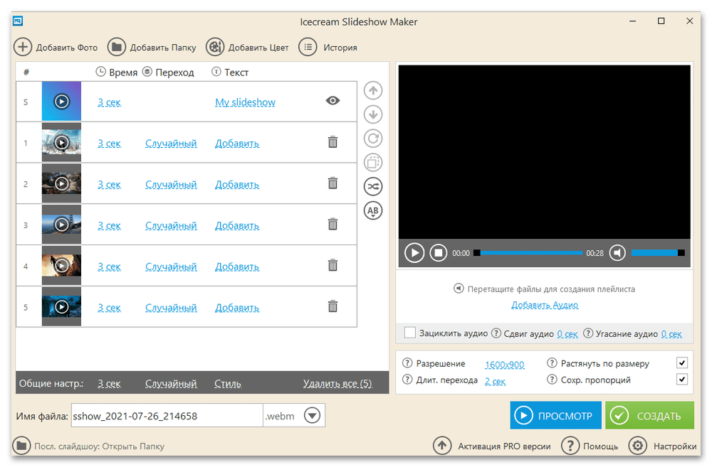 Если требуется удобное и простое в использовании ПО для создания видео из нескольких изображений всего за пару-тройку минут, то Slideshow Maker от Icecream легко справится с этим. В программе доступны только самые простые действия – установка времени перехода отдельно для каждого слайда, выбор разрешения будущего клипа, добавление текста с настройкой его расположения, анимации, шрифта и цвета. Есть возможность сортировать слайды по имени или в случайном порядке, а также подгружать музыку с применением эффекта нарастания/затухания и настройкой сдвига аудио относительно слайд-шоу.