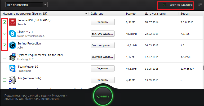 В IObit Uninstaller также есть опция пакетного удаления нескольких программ одновременно. Для этого их нужно выбрать в списке и нажать кнопку “Удалить”.