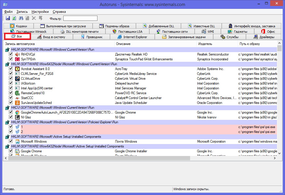 Autoruns – утилита от компании Sysinternals, приобретённой Microsoft. Обладает отличнейшим функционалом, но весьма скудным интерфейсом. Для работы с данной утилитой, необходимы знания на уровне уверенного пользователя ПК со знанием стандартных веток реестра. Начинающий пользователь ПК при работе с Autoruns может ненароком наломать дров, что придётся восстанавливать работу в безопасном режиме.