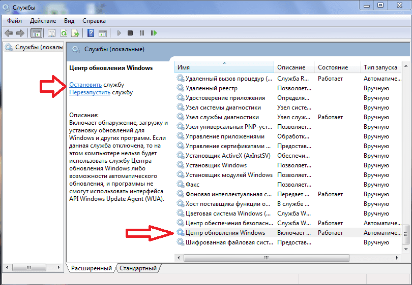 Шаг 3. Откроется оснастка «Службы». Щелкнуть на нужной службе и нажать «Остановить».
