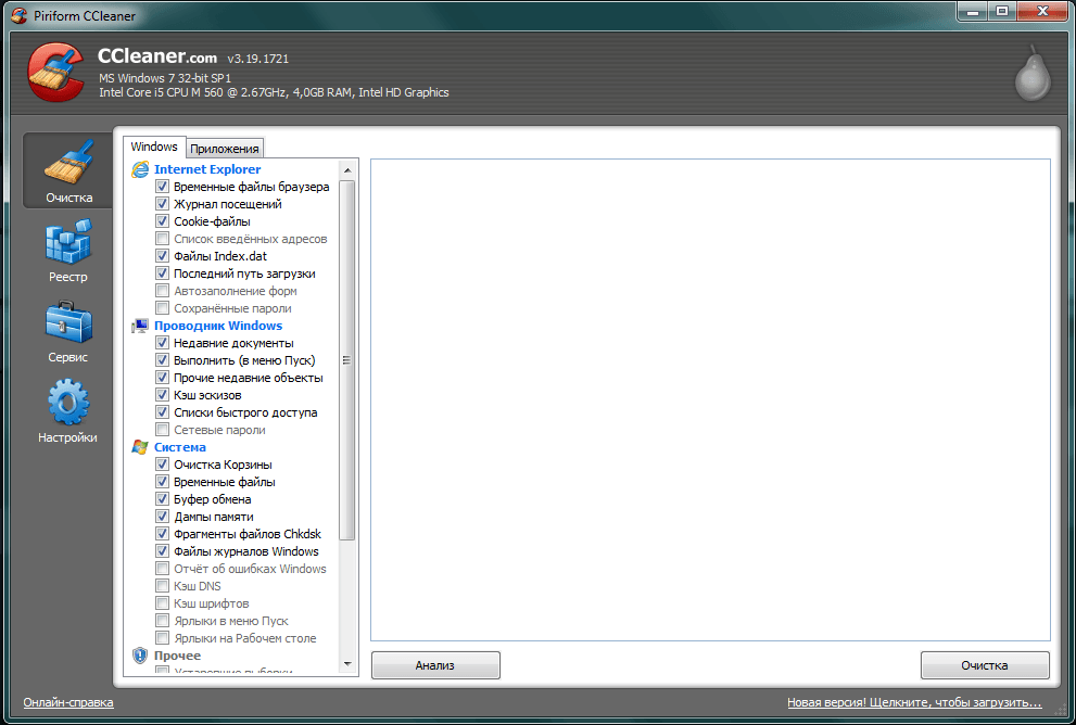 Запустите программу. В левой ее части на вкладке «Очистка» проставьте галочки напротив категорий файлов, которые желаете удалить. Рекомендуем оставить все настройки по умолчанию, если вы используете «CCleaner» впервые. Далее нажмите внизу на кнопку «Анализ».