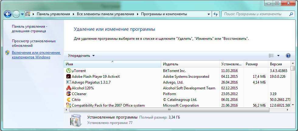 При нажатии верхней кнопки «Очистить» мы окажемся в системной папке «Программы и компоненты». Здесь будет представлен список всех программ, установленных на компьютере.