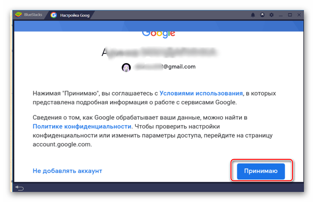 Принимаем условия использования сервисов Google. Настройка БлюСтакс почти завершена.