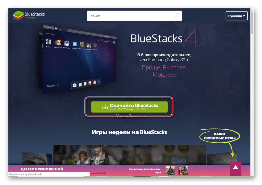 - С официального сайта скачиваем программу нажатием по кнопке «Скачайте BlueStacks».