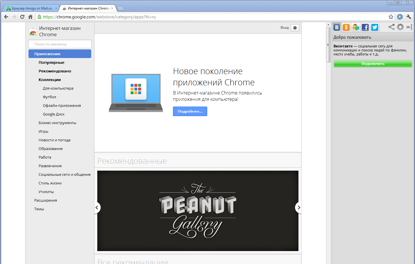 браузер Амиго от Mail.Ru очень похож на Google Chrome и Яндекс. Поэтому просмотр сайтов для пользователей, знакомых с этими разработками, будет привычным и понятным. Отличием от других браузеров является наличие в правой панели программы значков социальных сетей, с помощью которых можно иметь быстрый доступ к общению с друзьями. Чтобы отправить сообщение, нужно нажать на значок отправки сообщений, выбрать нужную социальную сеть, набрать сообщение и нажать на кнопку Отправить.