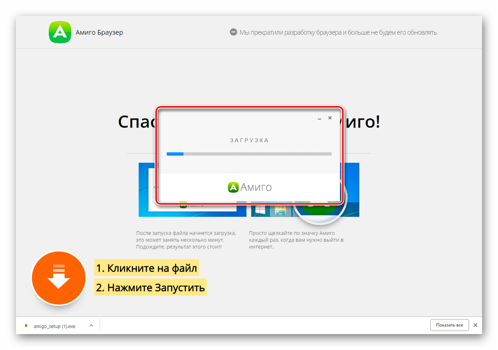 Далее начинается процесс установкиАмиго браузера для windows 7.