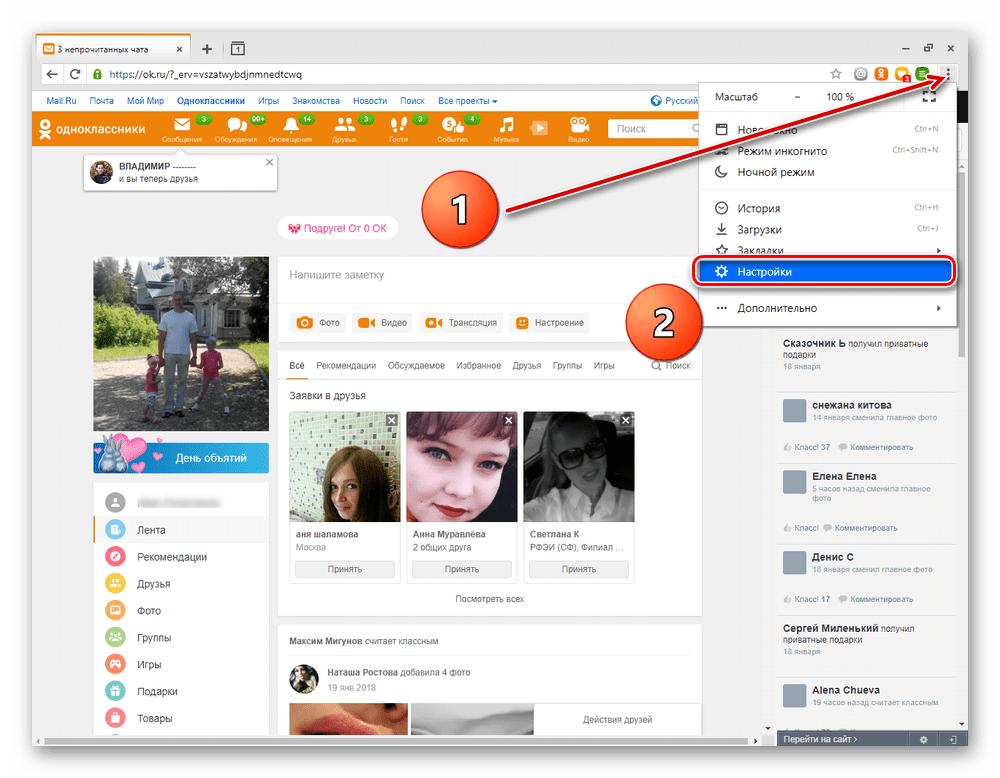 Кликаем на значок с тремя полосками в верхнем правом углу браузера для подключения ленты новостей Одноклассников.