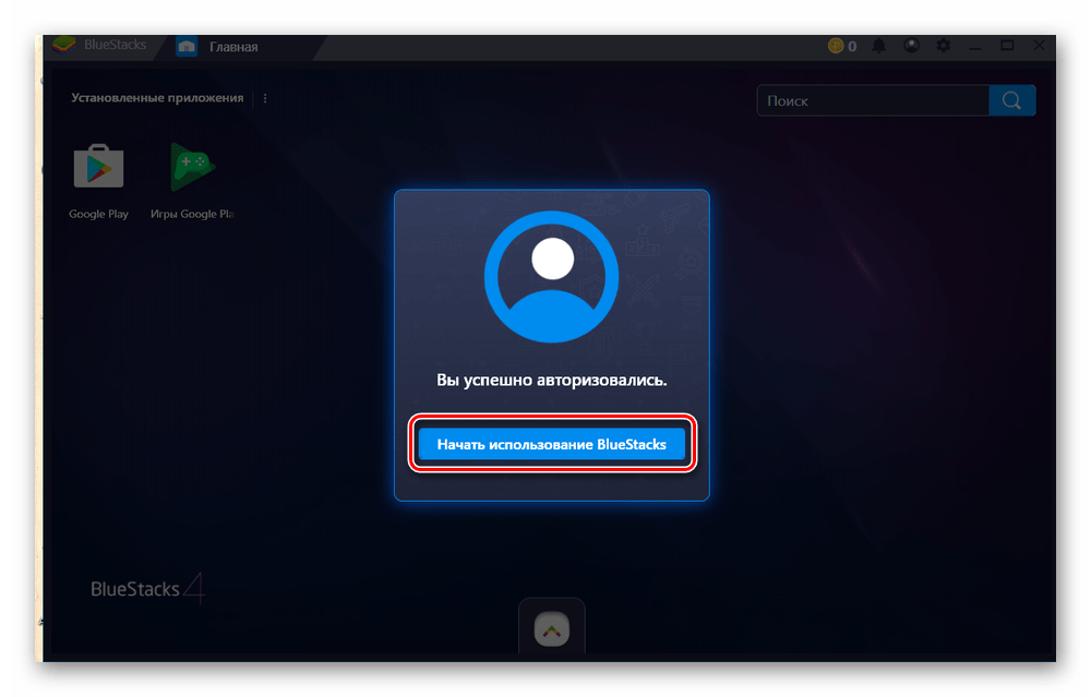 Появляется сообщение в окне программы, что вы успешно авторизовались. Остаётся нажать кнопку «Начать использование BlueStacks».