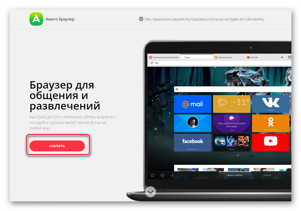- Заходим на сайт разработчика Амиго Браузер и нажимаем кнопку «Скачать» для загрузки программного продукта.
