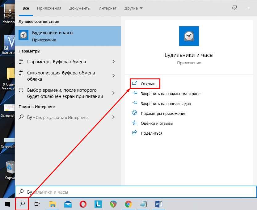 Нажимаем кнопку Пуск и пишем в поиске слово «будильник». Если ничего не найдено — наберите слово «Alarms».