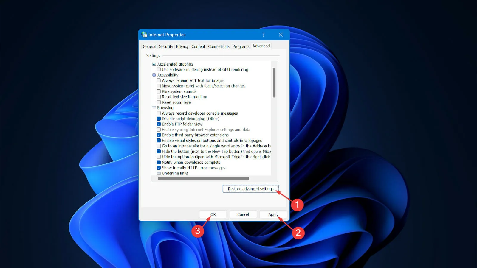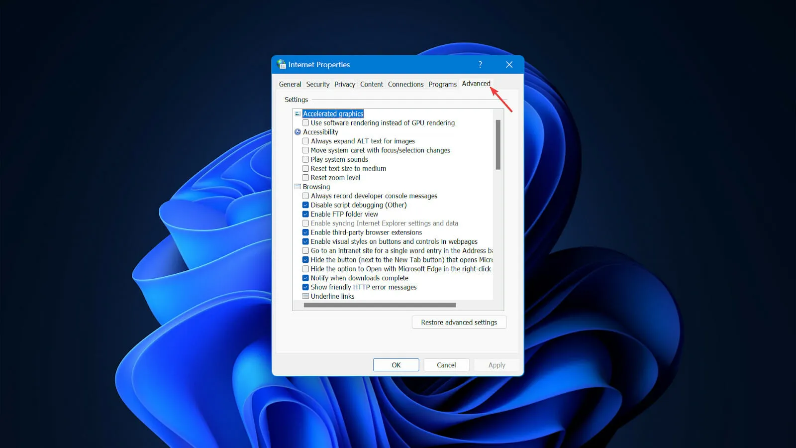 Прокрутите вниз и выберите параметр «Восстановить дополнительные настройки». Нажмите кнопку «Применить», а затем «ОК», чтобы применить изменения.