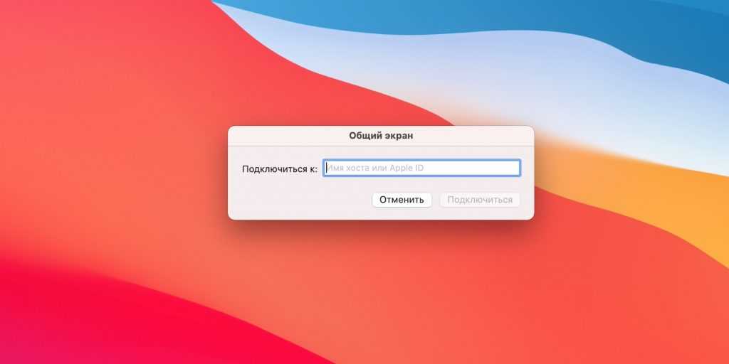 Чтобы подключиться к удалённому компьютеру, нужно найти в поиске Spotlight «Общий экран» и запустить эту программу. В появившемся окошке следует набрать Apple ID удалённого компьютера или имя его пользователя, если оно есть в списке контактов на текущем Mac. После этого остаётся только отправить запрос на подключение.