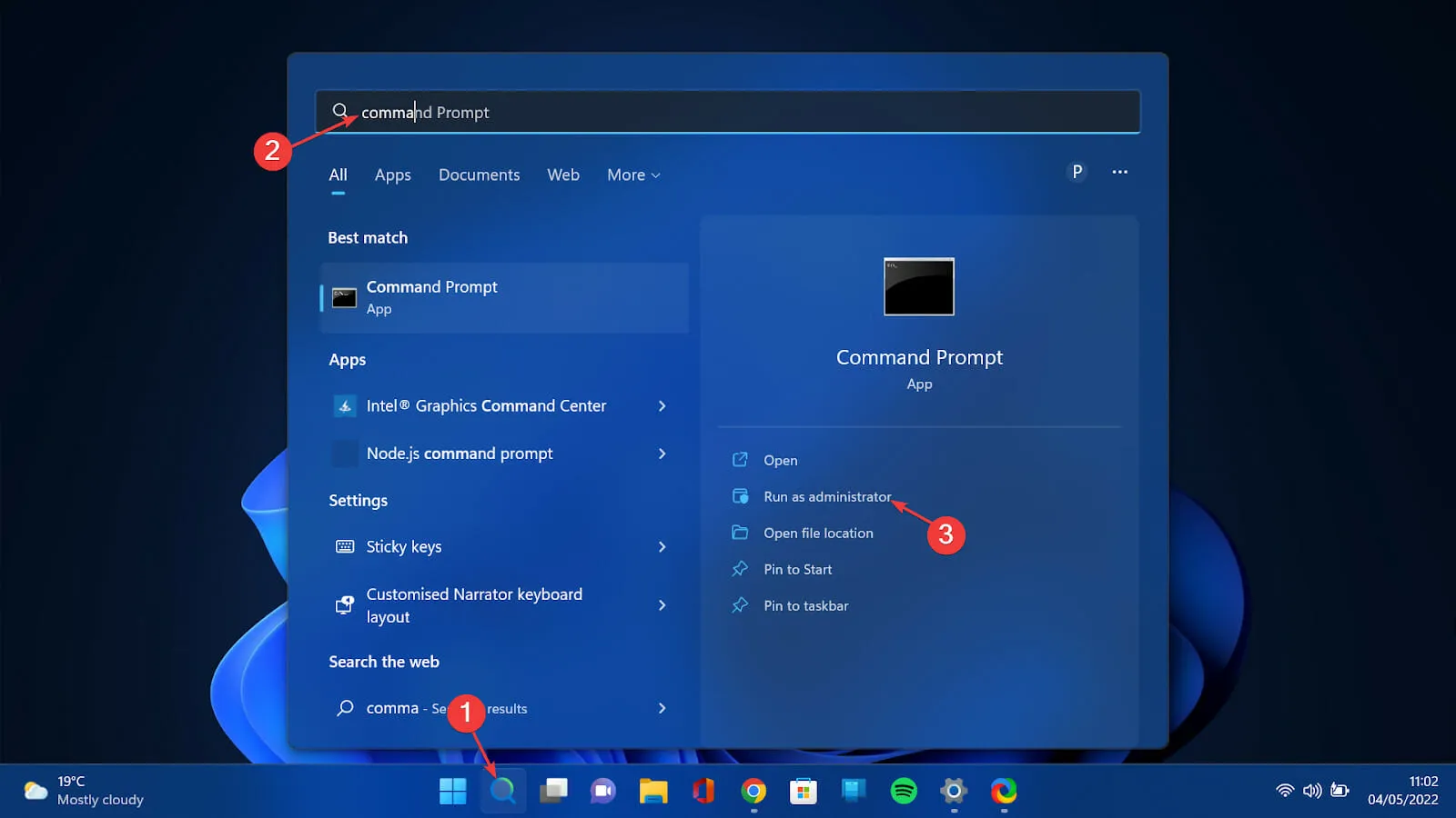Перейдите на панель «Начать поиск», введите «Командная строка» и выберите параметр «Запуск от имени администратора».