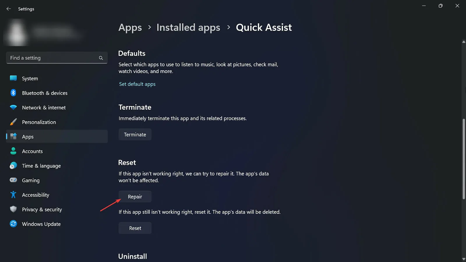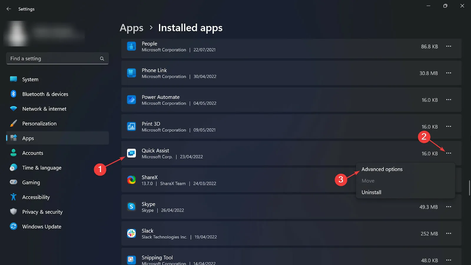 Найдите приложение Quick Assist, щелкните правой кнопкой мыши трехпунктирную линию и выберите «Дополнительные параметры», чтобы открыть дополнительные настройки.