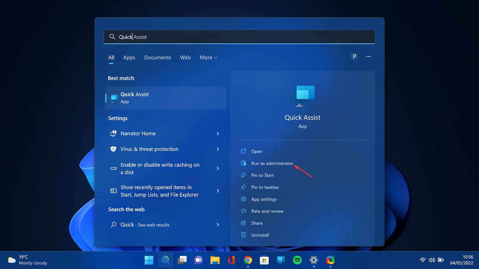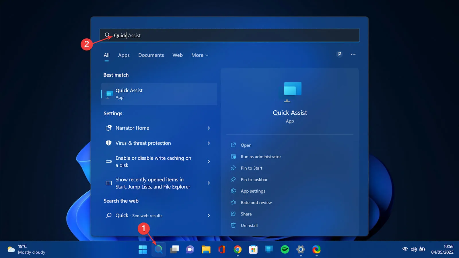 Перейдите к панели «Начать поиск» и введите Quick Assist.