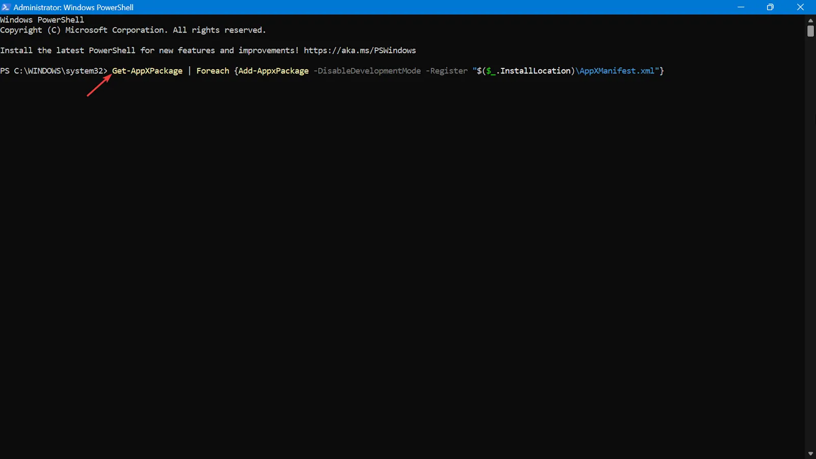 Когда оболочка откроется, введите следующую команду и нажмите Enter, чтобы запустить ее:Get-AppXPackage | Foreach {Add-AppxPackage -DisableDevelopmentMode -Register «$($_.InstallLocation)\AppXManifest.xml»}