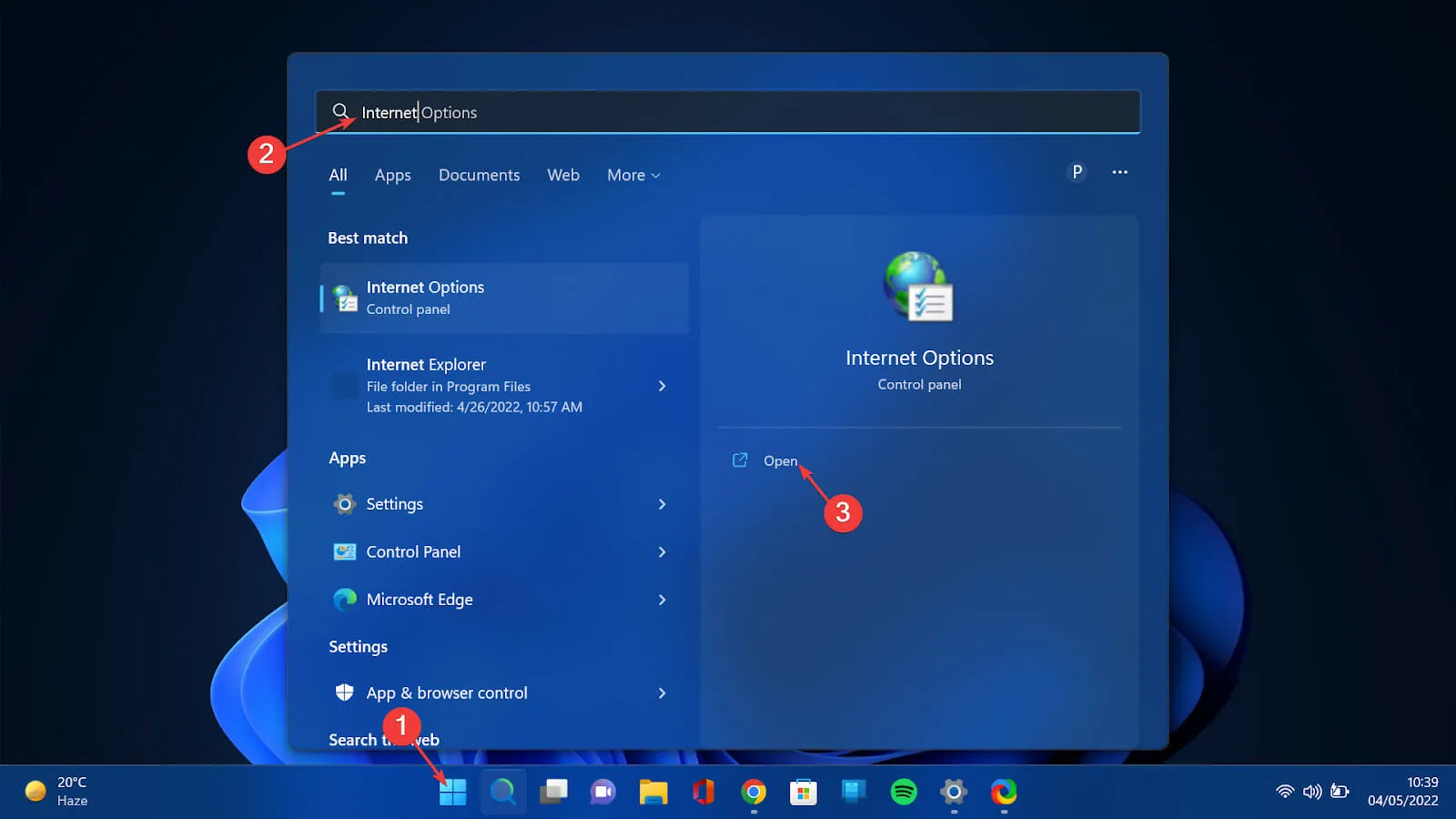 Перейдите в поле поиска, введите параметры Интернета и перейдите на вкладку «Открыть».