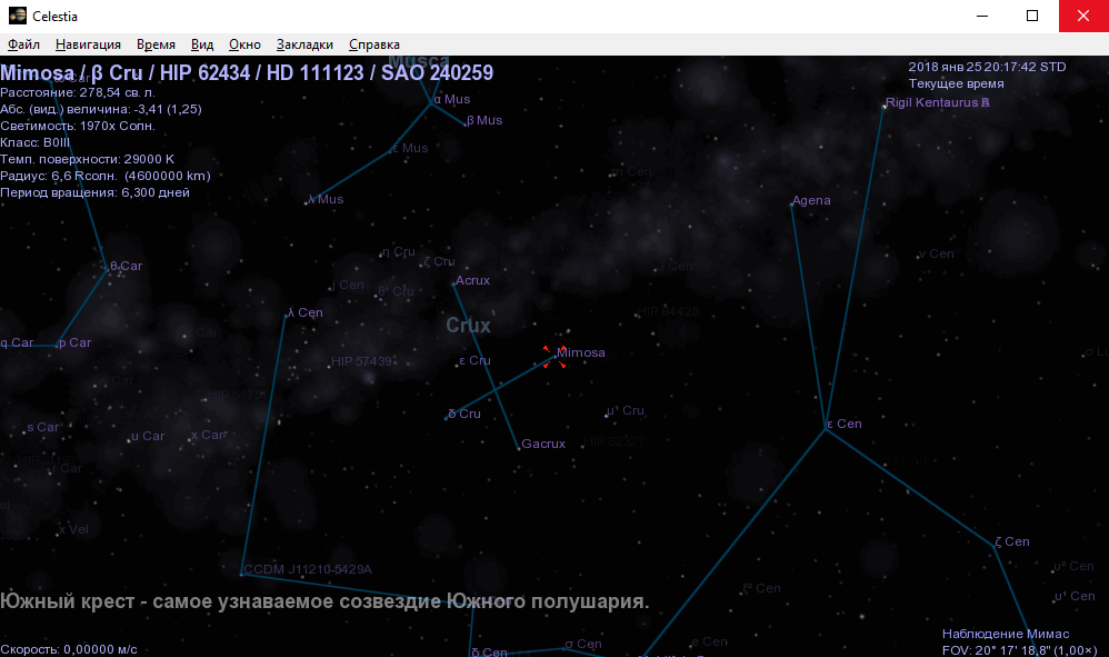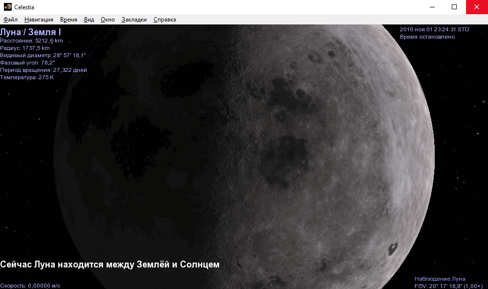 В левом окошке мы видим информацию об объекте, в нашем случае, о Земле (радиус Земли, фазовый угол, диаметр и др.). В низу слева отображена скорость полёта объекта во вселенной. Она показана равной нулю, хотя на самом деле – это далеко не так. В углу справа опять-таки данные о Земле.