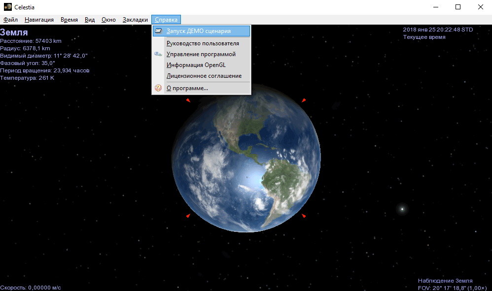 В правом верхнем углу отображается текущее время и дата. В левом верхнем углу программы отображаются краткие справочные данные о космическом объекте (расстояние до объекта, его радиус, видимый диаметр и фазовый угол). В левом нижнем углу показана скорость перемещения в пространстве (сейчас она равна нулю). В правом нижнем углу отображается информация о действиях в программе (сейчас это наблюдение планеты Земля).